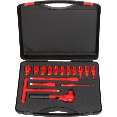 En 1000V-isolerad hylssats innehållande 72-tandat spärrskaft, T-handtag, förlängare, 6pt hylsor 7-22mm och insex 4-8mm
