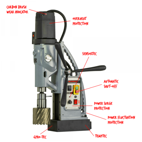 Robust magnetborrmaskin för kärnborr, spiralborr, försänkning och gängning, +version innebär mängder med nya innovativa funktioner.