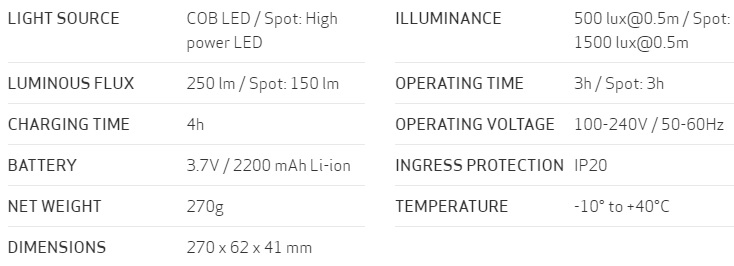 COB LED i arbetsljuset och 1 W High Power LED diod i toppljuset. 250 lumen / 500 lux vid 50 cm i arbetsljuset samt 150 lumen / 1500 lux vid 50 cm vid toppljuset.