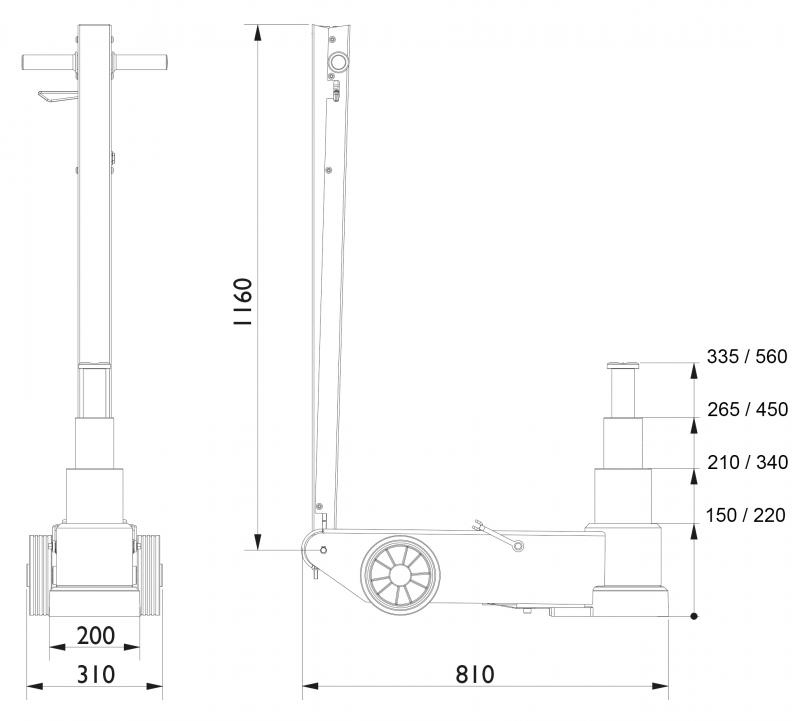 Min/max-höjd på 220/340/450/560mm, 3-stegs luftdomkraft till fordon med extra stor frihöjd, utformad för hård, intensiv och professionell användning.