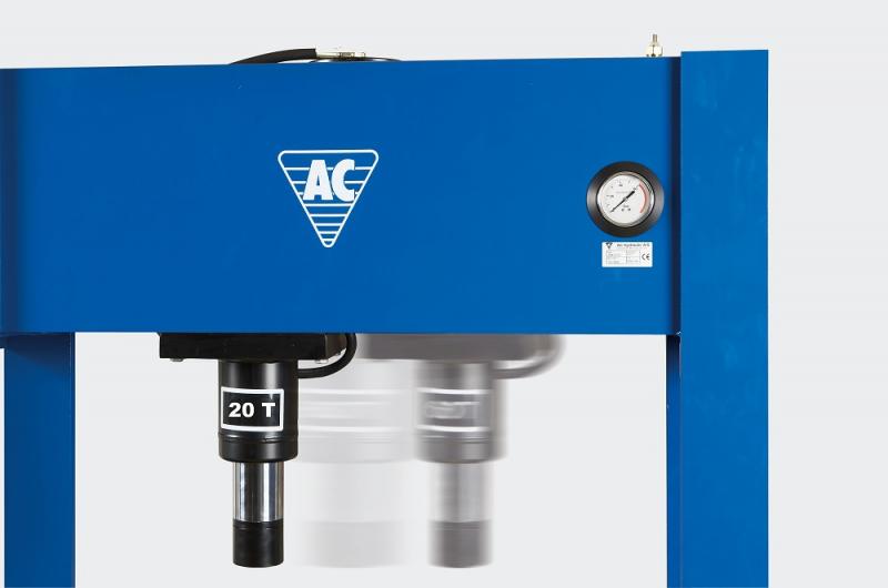 Handhydraulisk press till personbilsverkstäder och lätt industri, fotbetjänad tryckluftsstyrd snabbgång av presskolven för snabb och precis fixering.