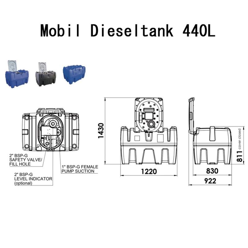 Mobil adbluetank tillverkad i slittålig högdensitetspolyeten, 12V självsugande vingpump, automathandtag, slang av NBR-gummi och sugfilter.