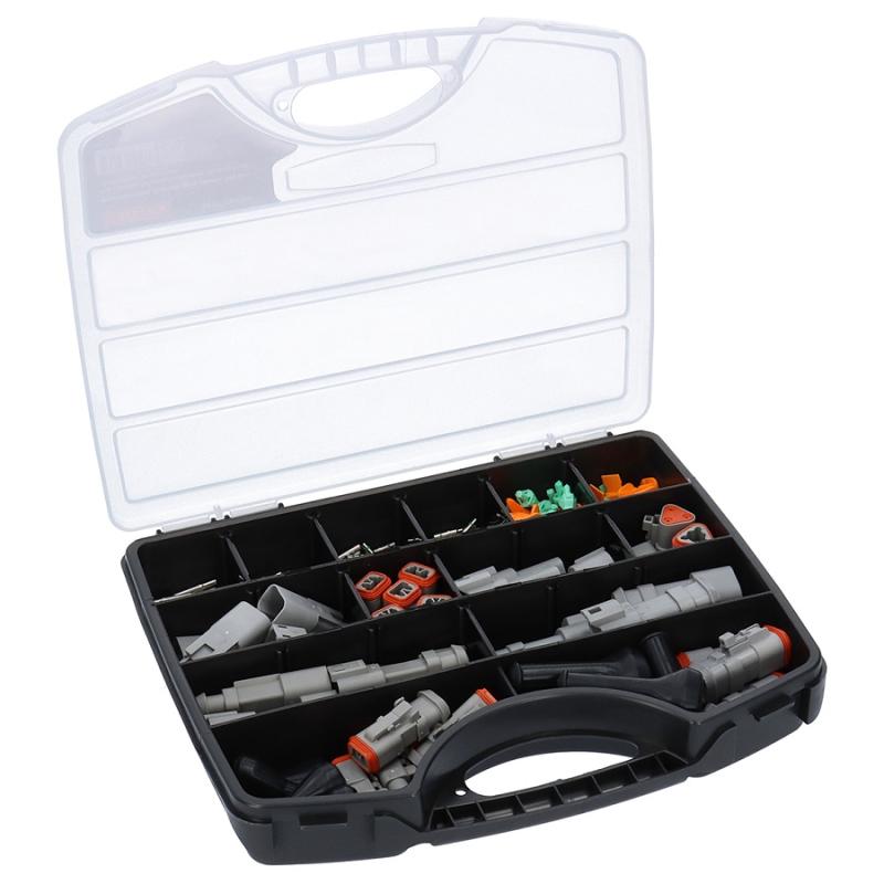 Sortiment med Deutschkontakter, innehåller ca 300 delar med komponenter till 2-3 poliga DT-kontakter.