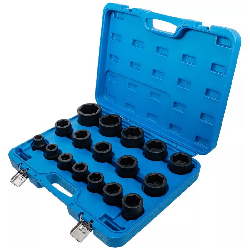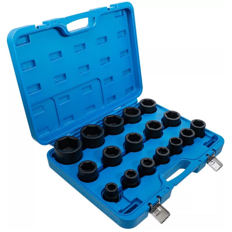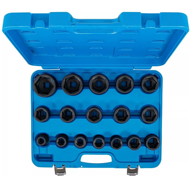 En stor sats med 17st krafthylsor, 3/4"-fattning, kort utförande och storlekar från 19 upp till 55mm, levereras i robust plastväska.