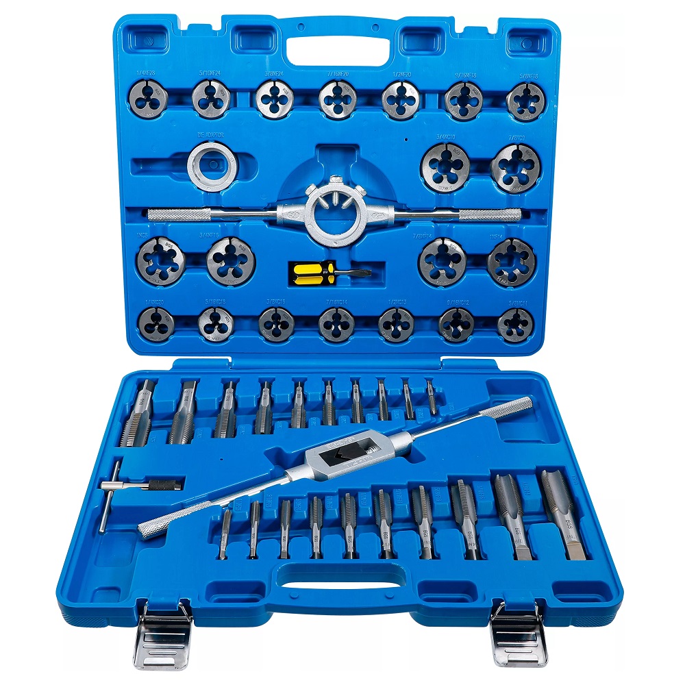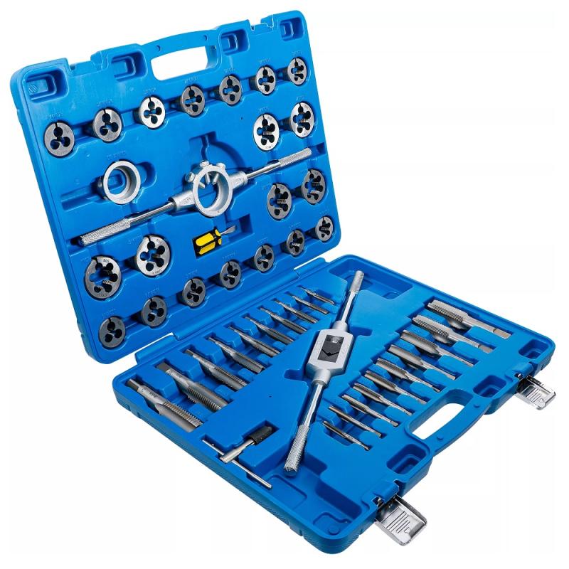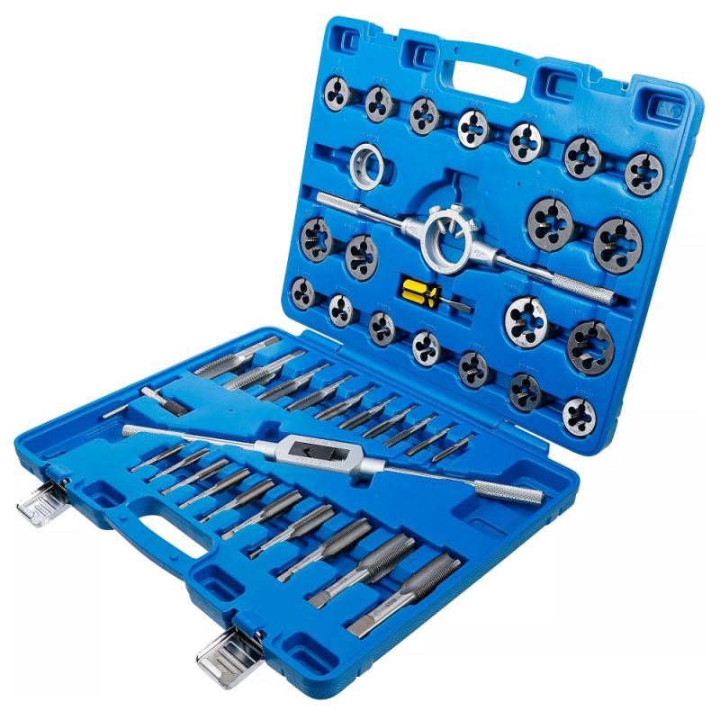 Gängssats till UNF/UNC-gängor, 20st gängtappar, 20st gängsnitt samt hållare och adaptrar, kommer komplett i formgjuten plastväska.