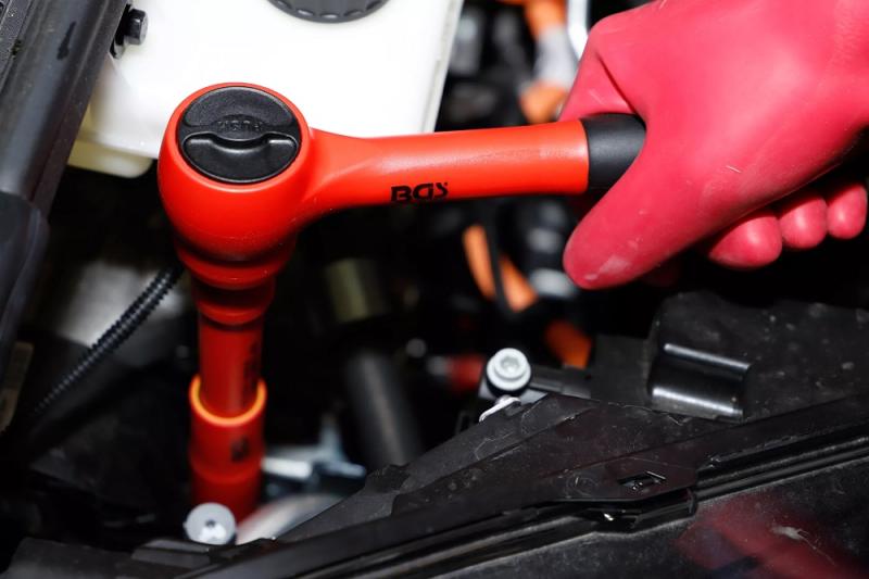 En 1000V-isolerad hylssats innehållande 72-tandat spärrskaft, T-handtag, förlängare och 6pt hylsor 10-24mm.