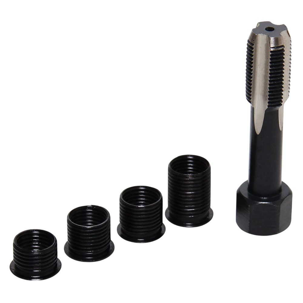 En sats med gängtapp och insatshylsor för tändstift/glödstift på motorer, levereras med insatshylsor i 4st olika längder.