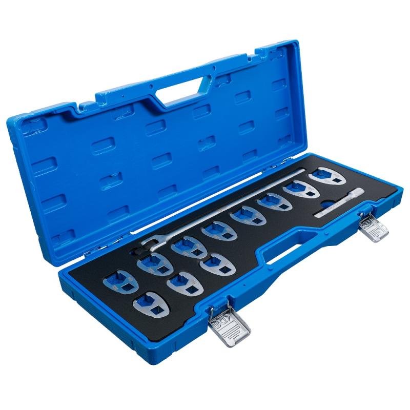 En sats med sexkants kråkfotsgrepp, varje del ligger i utskuren eva-foam och levereras i robust plåtlåda.