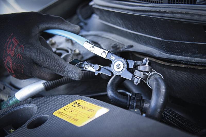 Slangklammertång med spärrfunktion/låsfunktion, används till självlåsande slangklämmor.