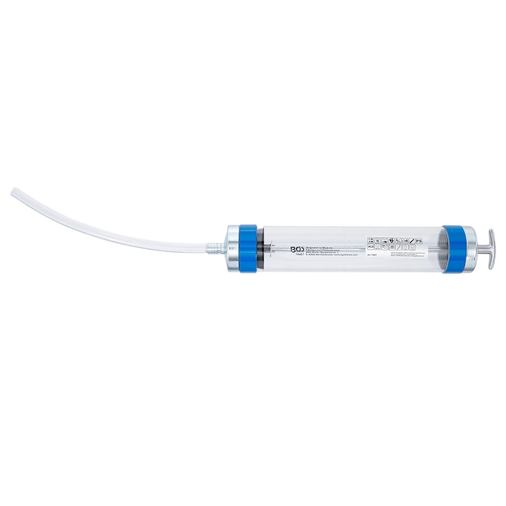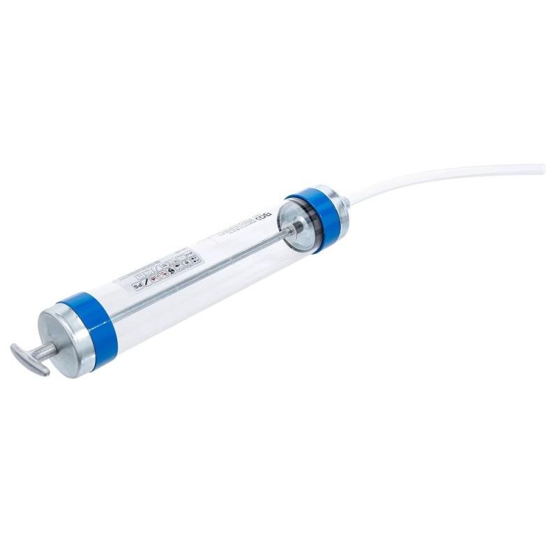 Manuell sug/tryckpump med dubbla tätningar, genomskinligt hus och slang för att lätt se vätskan, kan användas till oljor, kylvätskor m.m