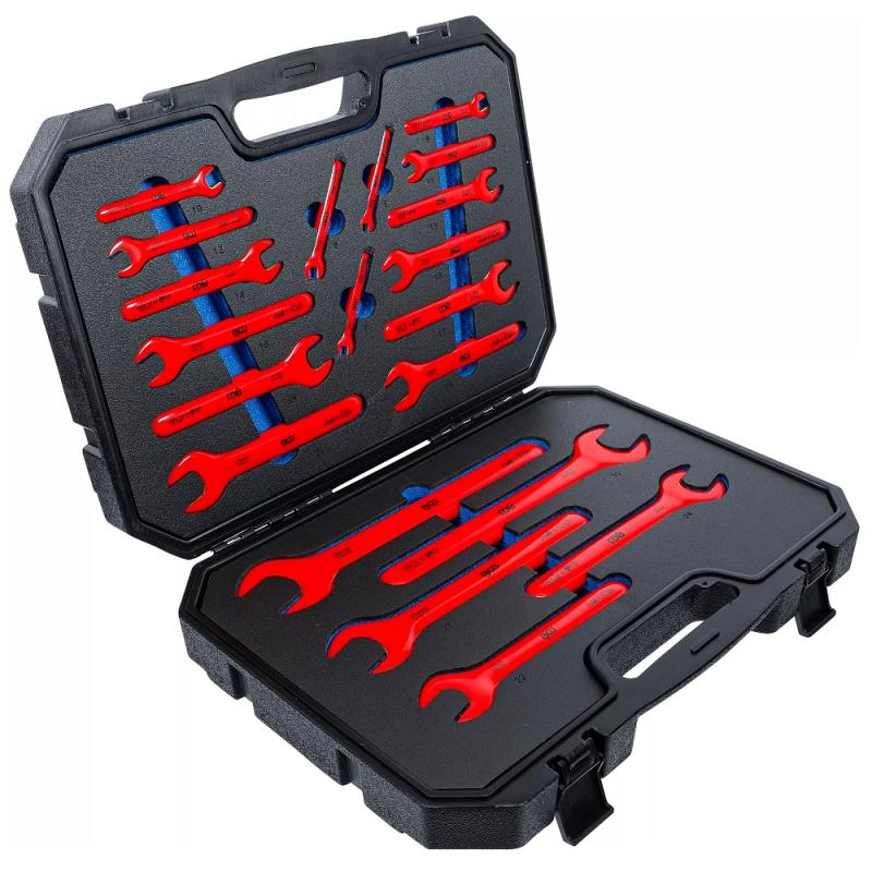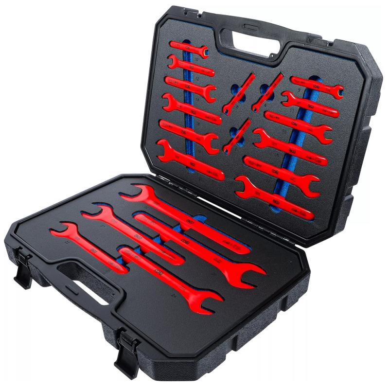 VDE-isolerade u-nycklar komplett i en robust plastväska, utskuren EVA-foam med storleksmärkning.