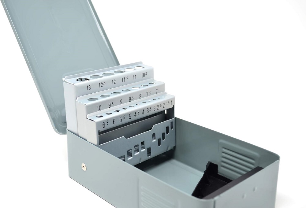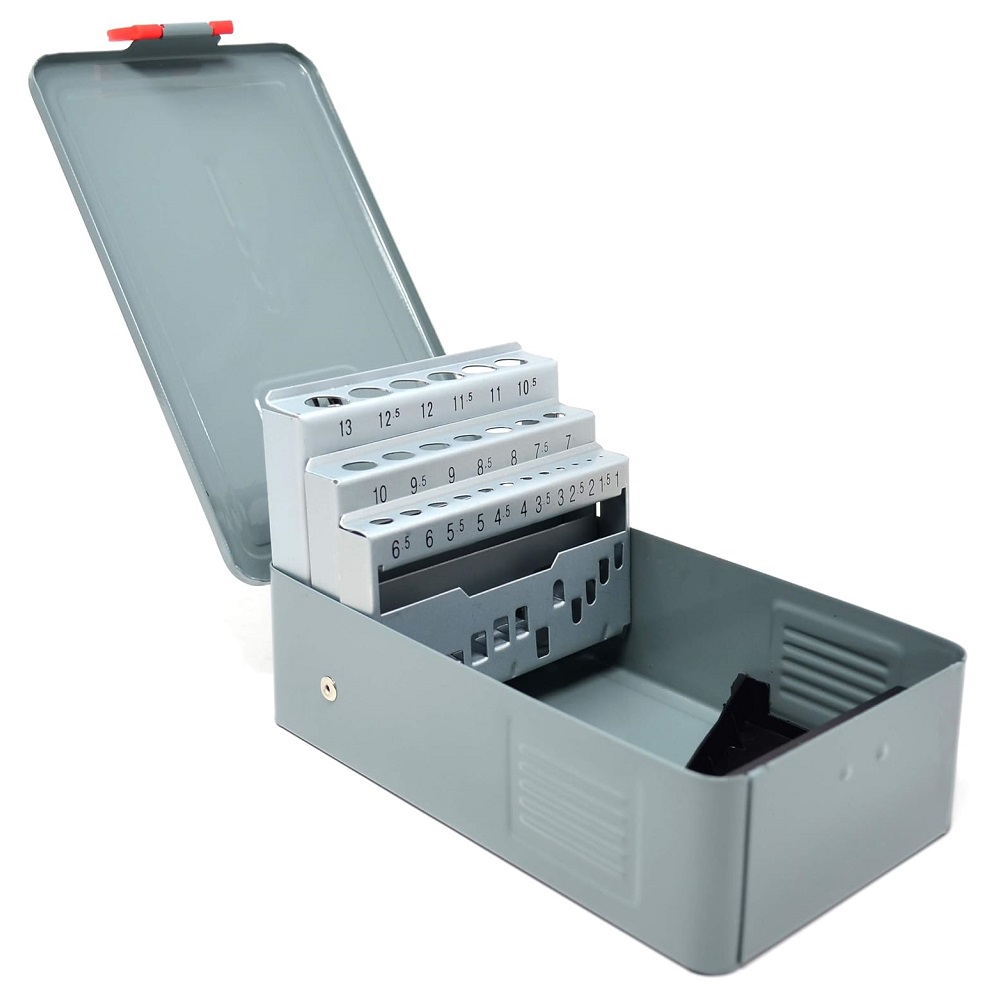 Tom borrkassett i plåt med plats för totalt 25st, 1-13mm i 0,5mm steg.