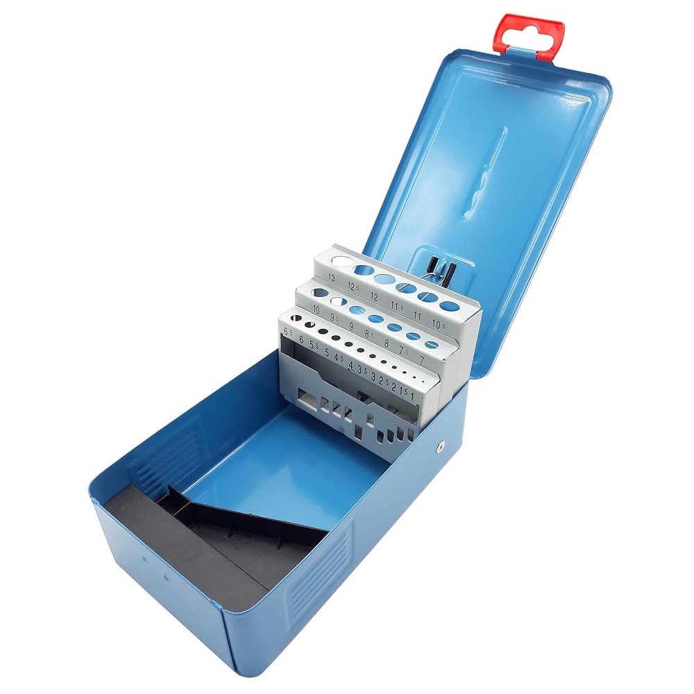 Tom borrkassett i plåt med plats för totalt 25st, 1-13mm i 0,5mm steg.