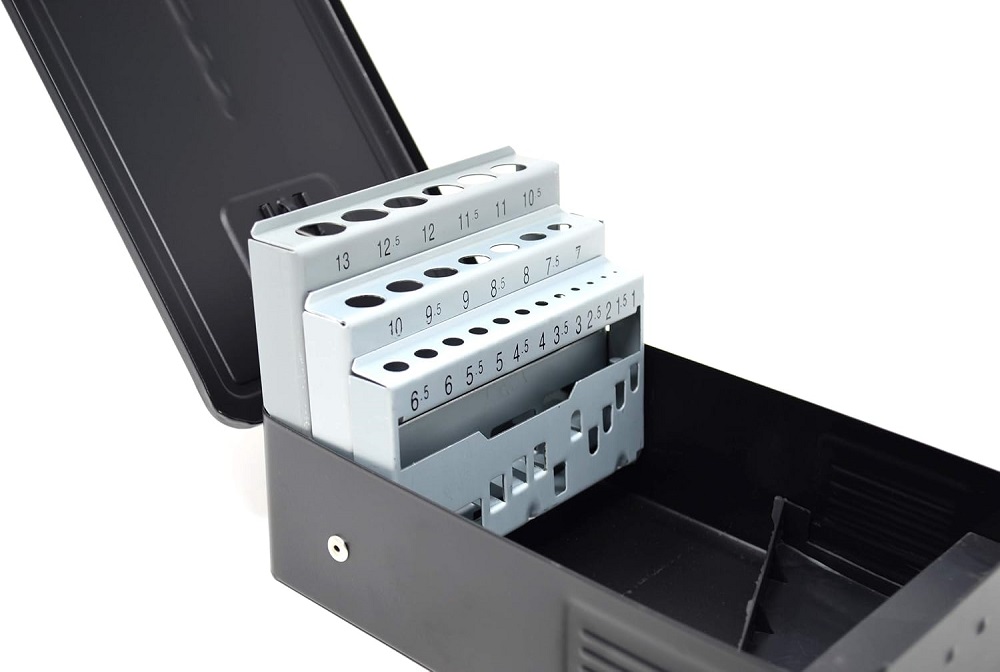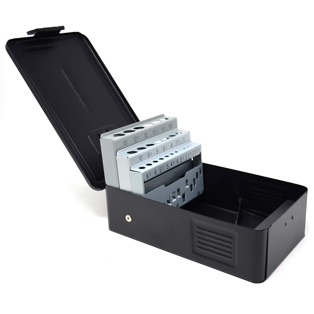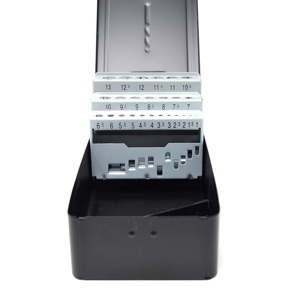 Tom borrkassett i plåt med plats för totalt 25st, 1-13mm i 0,5mm steg.