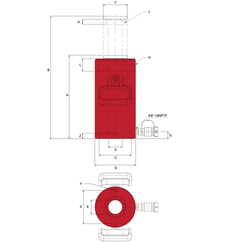 Hålcylinder 100 ton med 76 mm slaglängd, enkelverkande med kraftig fjäder för snabb retur av kolv.