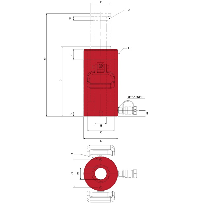 Hålcylinder 12 ton med 41 mm slaglängd, enkelverkande med kraftig fjäder för snabb retur av kolv.