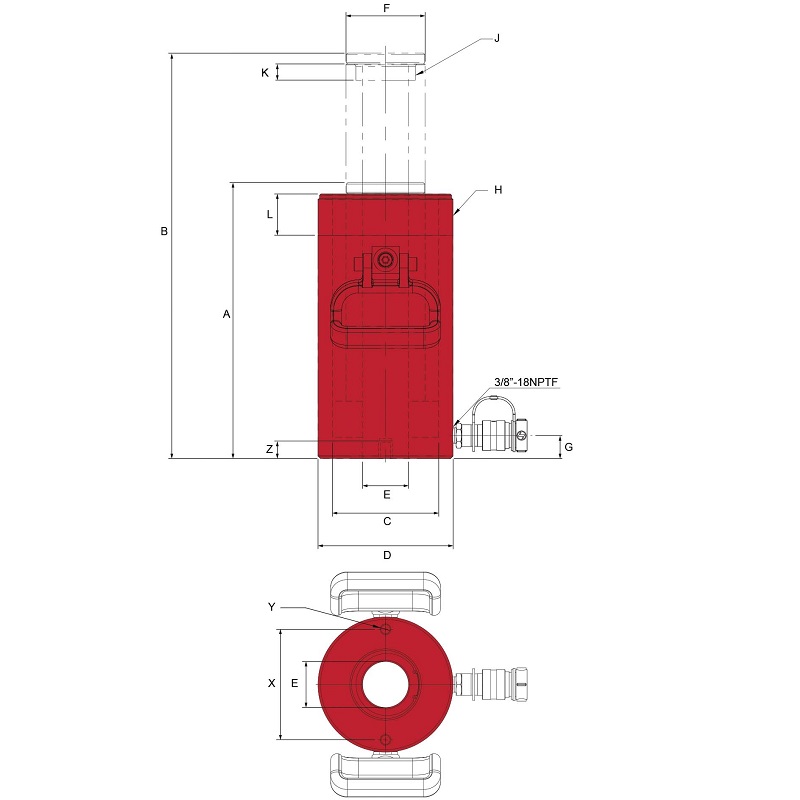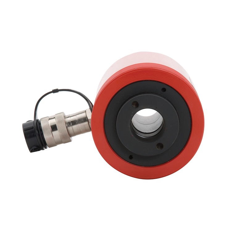 Hålcylinder 30 ton med 64 mm slaglängd, enkelverkande med kraftig fjäder för snabb retur av kolv.