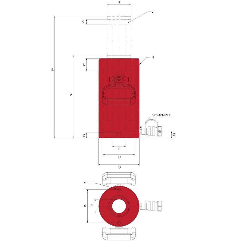 Hålcylinder 60 ton med 152 mm slaglängd, enkelverkande med kraftig fjäder för snabb retur av kolv.