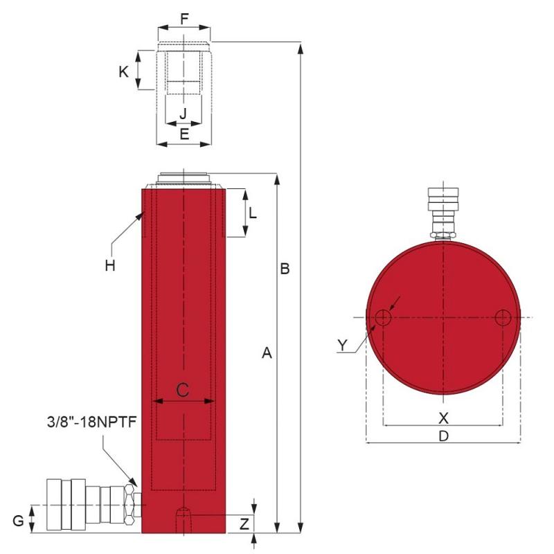 Tryckcylinder 25 ton med 362 mm slaglängd, enkelverkande med kraftig fjäder för snabb retur av kolv.