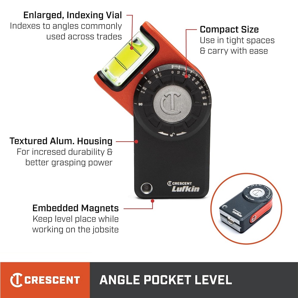 - Crescent Lufkin special vinkel-fickvattenpass med svängbart huvud är det perfekta verktyget för exakta mätningar i trånga utrymmen och på ojämna ytor.