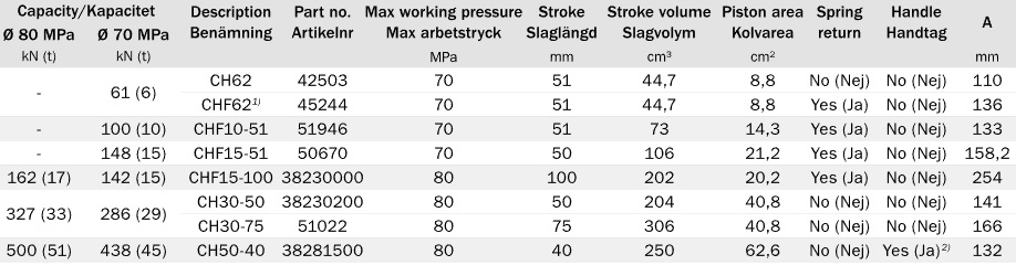 - Hålcylinder CHF62 är utrustad med returfjäder medan typ CH62, CH30-50 och CH50-40 kräver lastretur.