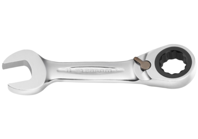 Sats med korta (stubby) ringspärrnycklar från Facom, endast 5° omtagsvinkel (6° för 7, 8 och 9 mm), satin chrome finish.