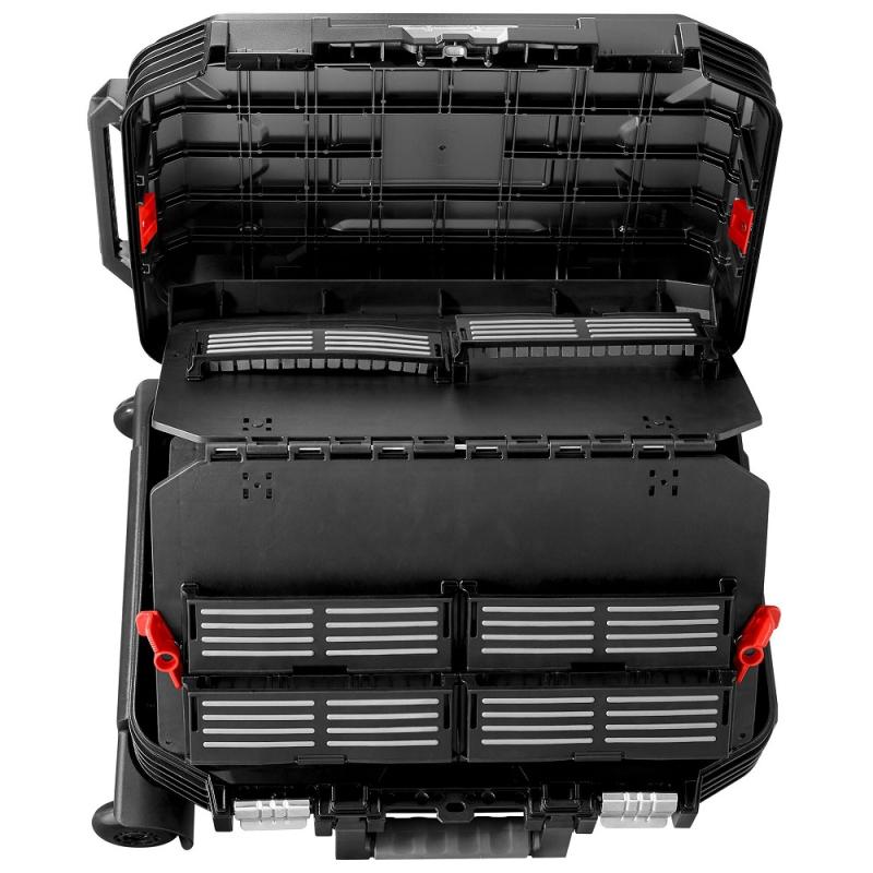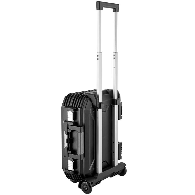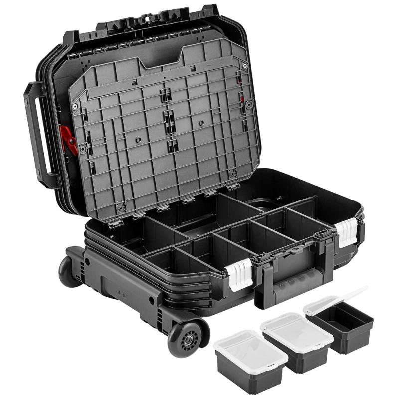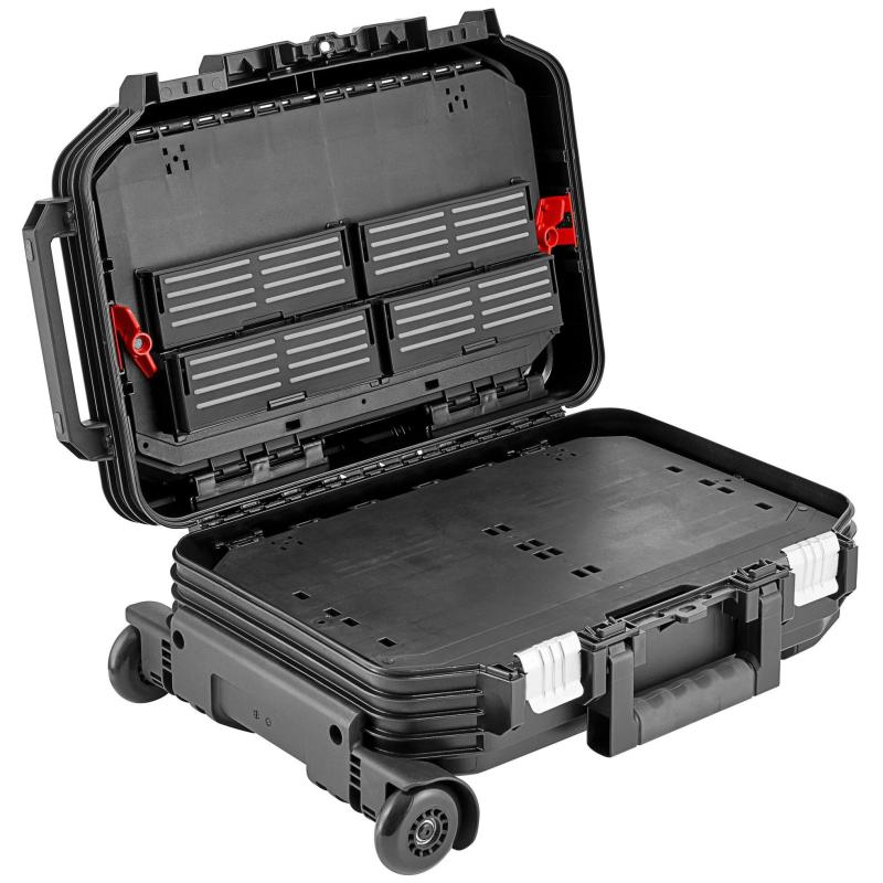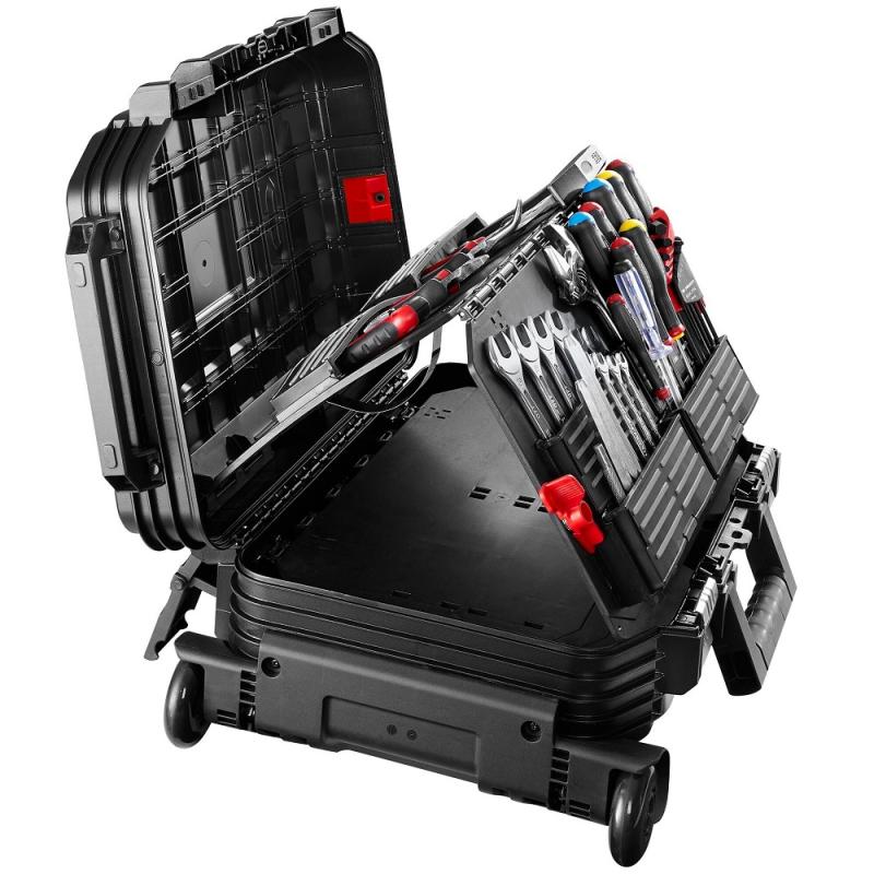 En robust "verktygsresväska" för teknikern, tillverkad i glasfiberarmerad PP, gångjärn i metall, ergonomiskt gummihandtag.