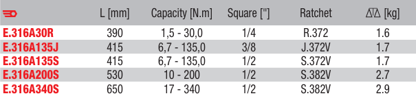 - OBS! Tabellen nedan är ofullständig, en större momentnyckel har tillkommit och går att välja i listan (163-815Nm, 3/4")