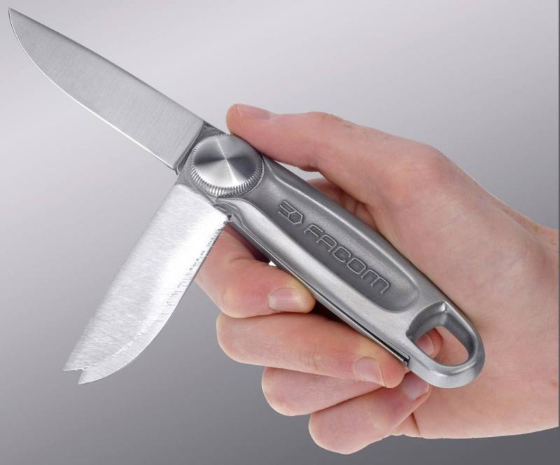 Facom fällkniv i 100% rostfritt material. Levereras i skinnetui som kan fästas i bältet. Idelisk för marina miljöer.
