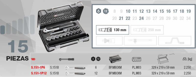 OBS! Bild finns bifogad nedan för en bättre översikt/innehållsförteckning av Facom's 3/8" hylsnyckelsatser med 15 delar.
