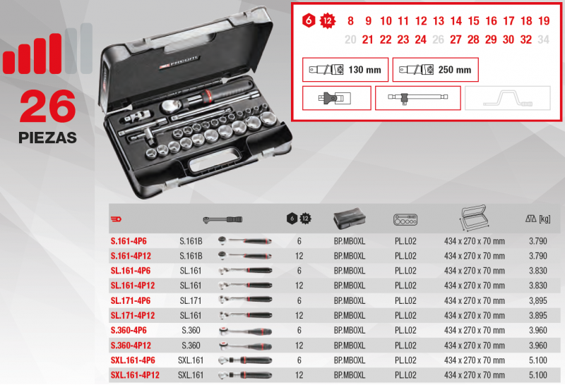 OBS! Bild finns bifogad nedan för en bättre översikt/innehållsförteckning av Facom's 1/2" hylsnyckelsatser med 26 delar.