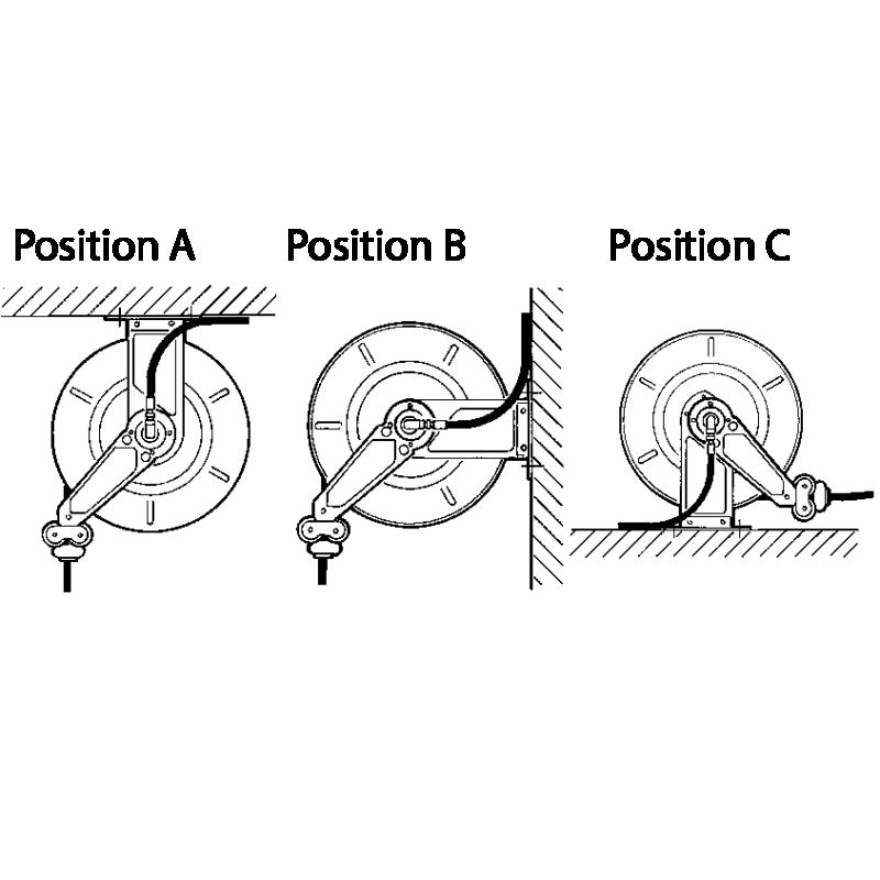 - Fäst konsolerna kan monteras i tre olika positioner på slangrullen för att tillåta vägg, tak eller golvmontage.