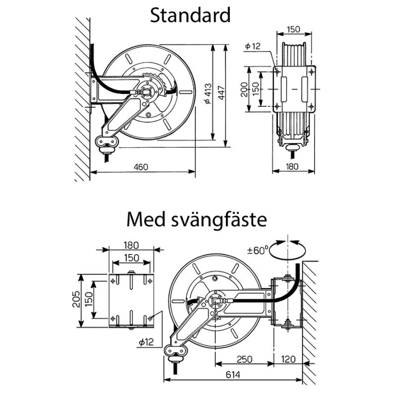 Luft - Vatten - Olja, 60 bar, professionell vinda i målad metall, ställbara utmatningsarmar, kan takmonteras, lätt att placera även i trånga utrymmen.