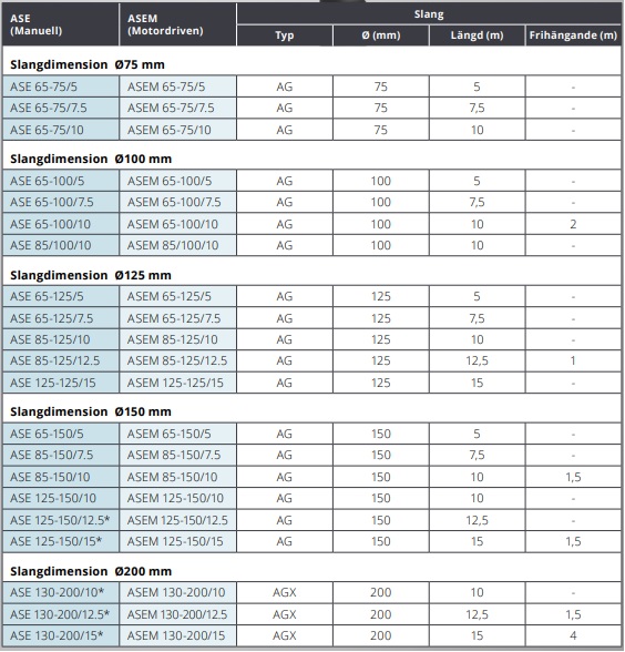 - ASE/ASEM 65, 85, 125 är standardutrustade med överkörningsbar högkvalitetsslang i EPDM, som finns i dimensionerna Ø75/100/125/150 mm.