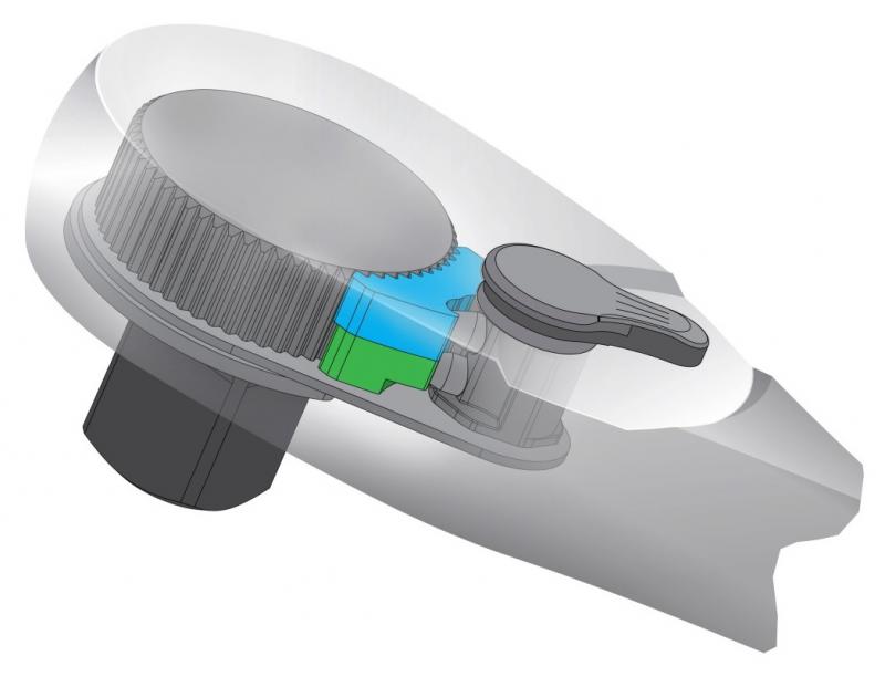 - Principen är ett 60 tandat kugghjul med dubbla mothåll som ligger något förskjutna vilket gör att man får ett 120 tandat spärrskaft med 3 graders manövreringsutrymme.