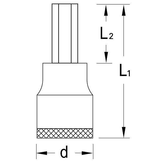 Hylsa med extra lång insextapp (EJ stegad, dvs samma dimension hela klingan), tillverkade med lättrad ovankant för att kunna skruva med fingrarna.