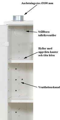 Skåpet är försett med ventilationskanal med utsugspunkter som gör att mellanrummet mellan alla hyllplan ventileras. Frånluftstos på skåpets tak (Ø 100 mm)