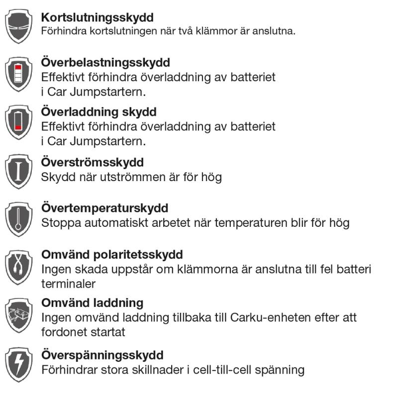 - Är utrustad med display för att lätt kunna avläsa statusen på startboostern, för att alltid ha den fulladdad och redo att hjälpa.