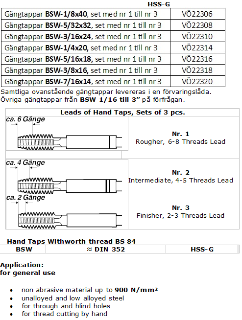 Handgängtappar i set om 3 stycken som levereras i förvaringslåda. För material upp till 900N/mm².