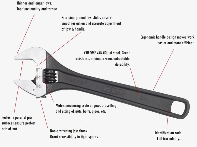 Skiftnycklar i högsta kvalite, precionshärdat, rostskyddat kromvanadium kvalitetsstål med avsmalnande käftar i 15° vinkel för optimal åtkomlighet.