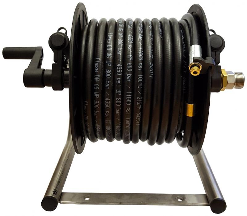 15 meter flexibel kloakslang på slangvinda av plast samt stativ av rostfritt stål.