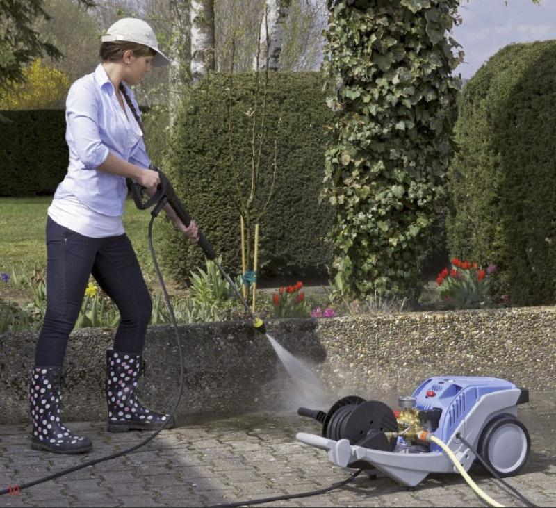 Vattenmängd: 10 l/min -115 bar - Komplett med 15 m slang på vinda, högtryckspistol och spolrör.