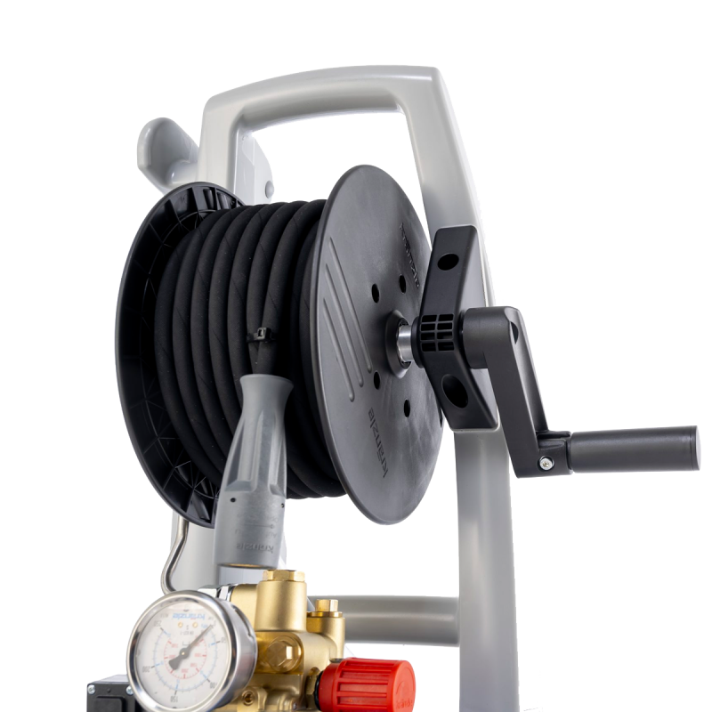 Vattenmängd: 10 l/min -130 bar - Komplett med 15 m slang på vinda, högtryckspistol och spolrör.