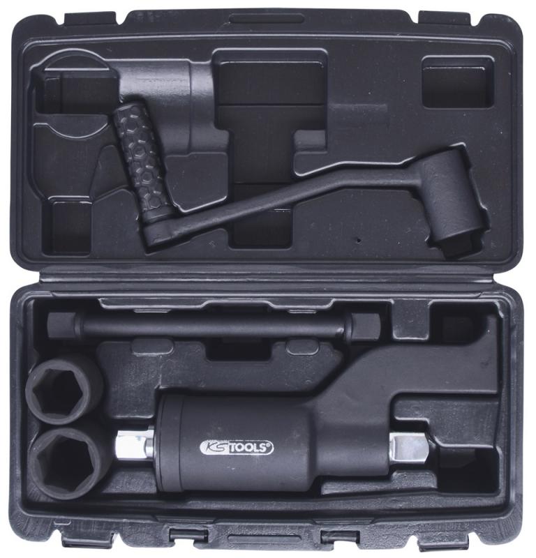 Kraftig momentomvandlare för lossdragning av rejält åtsittande bultar och muttrar, levereras i robust plastväska.