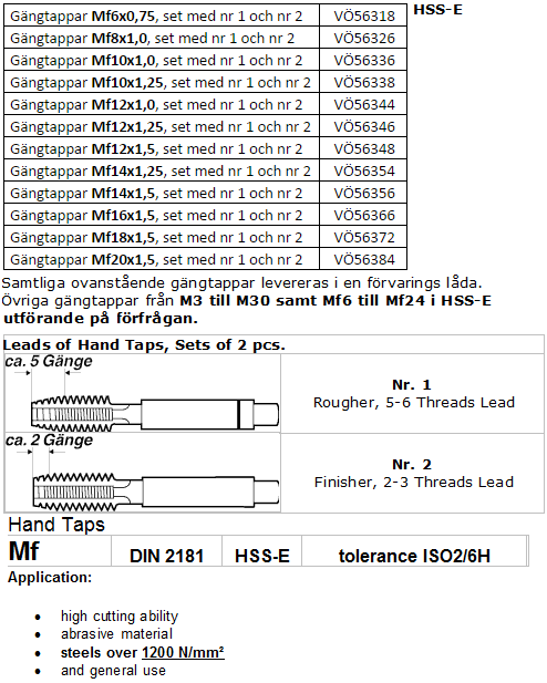 Metrisk fingängade gängtappar i set om 2 stycken som levereras i förvaringslåda. För material upp till 1200N/mm.