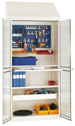 Helsvetsat Miljöskåp med plåtdörrar eller dörrar med härdat glas.Ventilationsstos Ø100 mm. i tak.Lås inkl. 2 nycklar ingår.Skåpet kan utrustas med hyllor (med eller utan uppvikta kanter), uppsamlingstråg i botten, utdragbara hyllor osv.