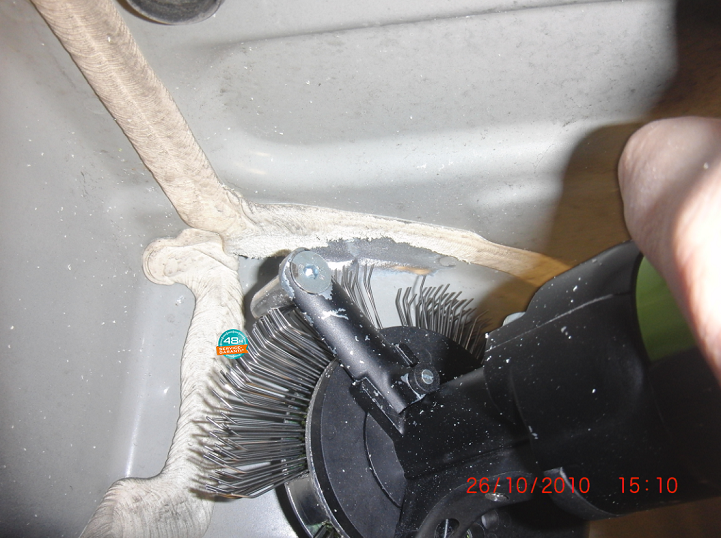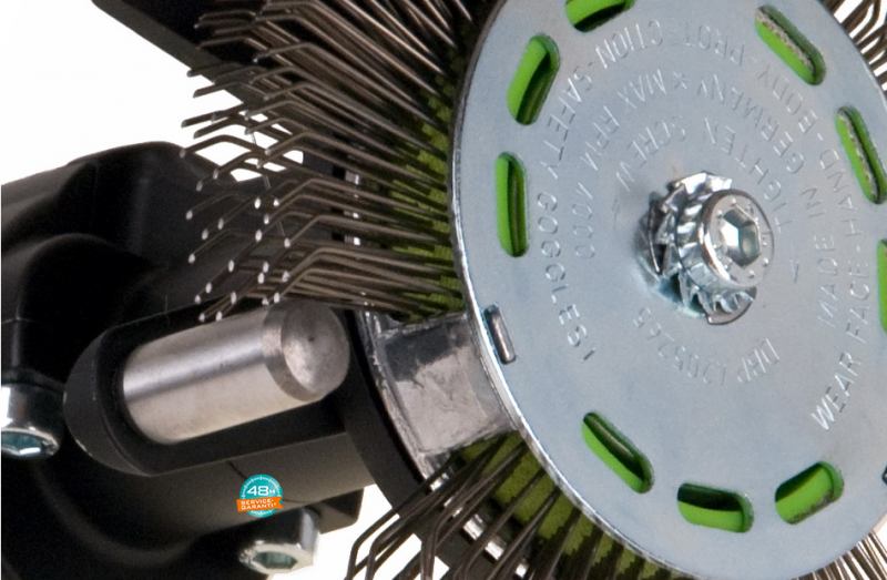 Borstarna piskas ner i material med hjälp av en axel som stoppar upp borsten precis innan dem når materialet.