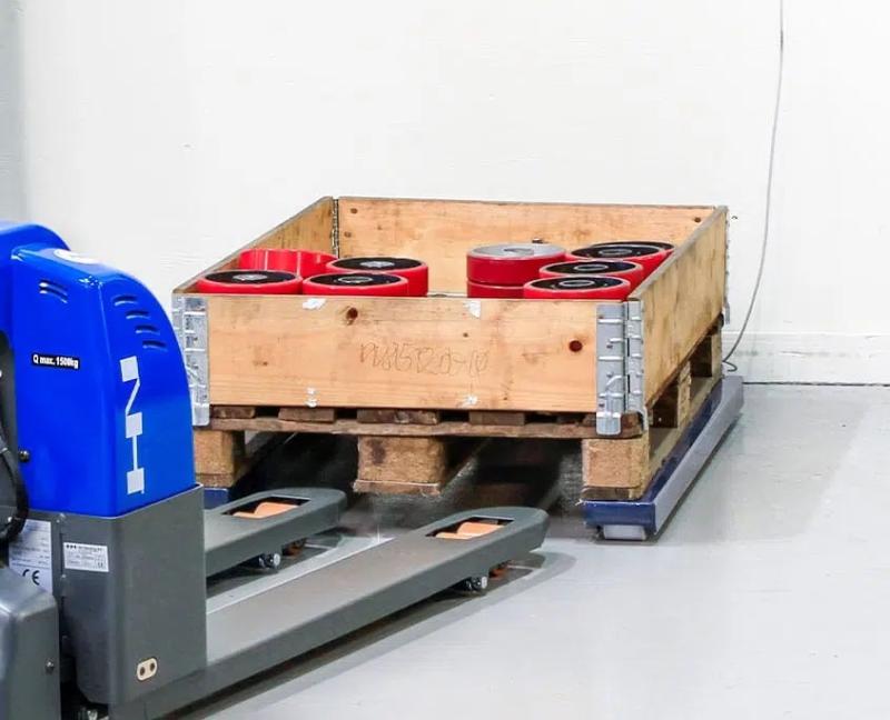 Mobil uppladdningsbar pallvåg, väger endast 38kg och är försedd med hjul längst ut på "gafflarna" för enkel förflyttning.