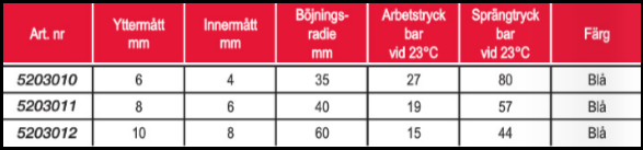 - PA-slangen används främst i pneumatikapplikationer, tål höga tryck och temperaturer.