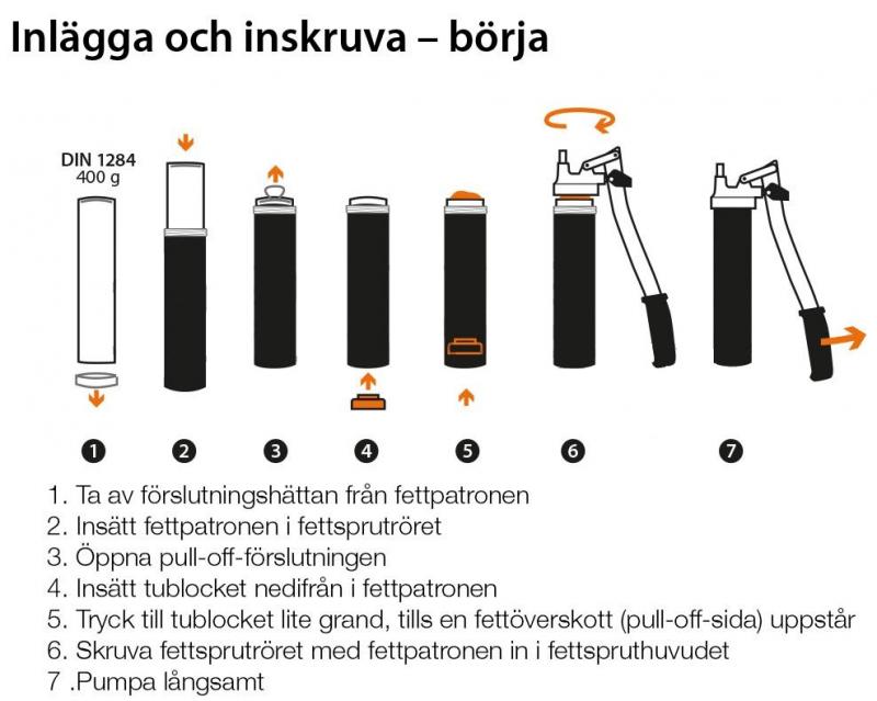 - Genom vakuumet i pumphuvudet rör sig tublocket uppåt och helt tömmer patronen på fett.